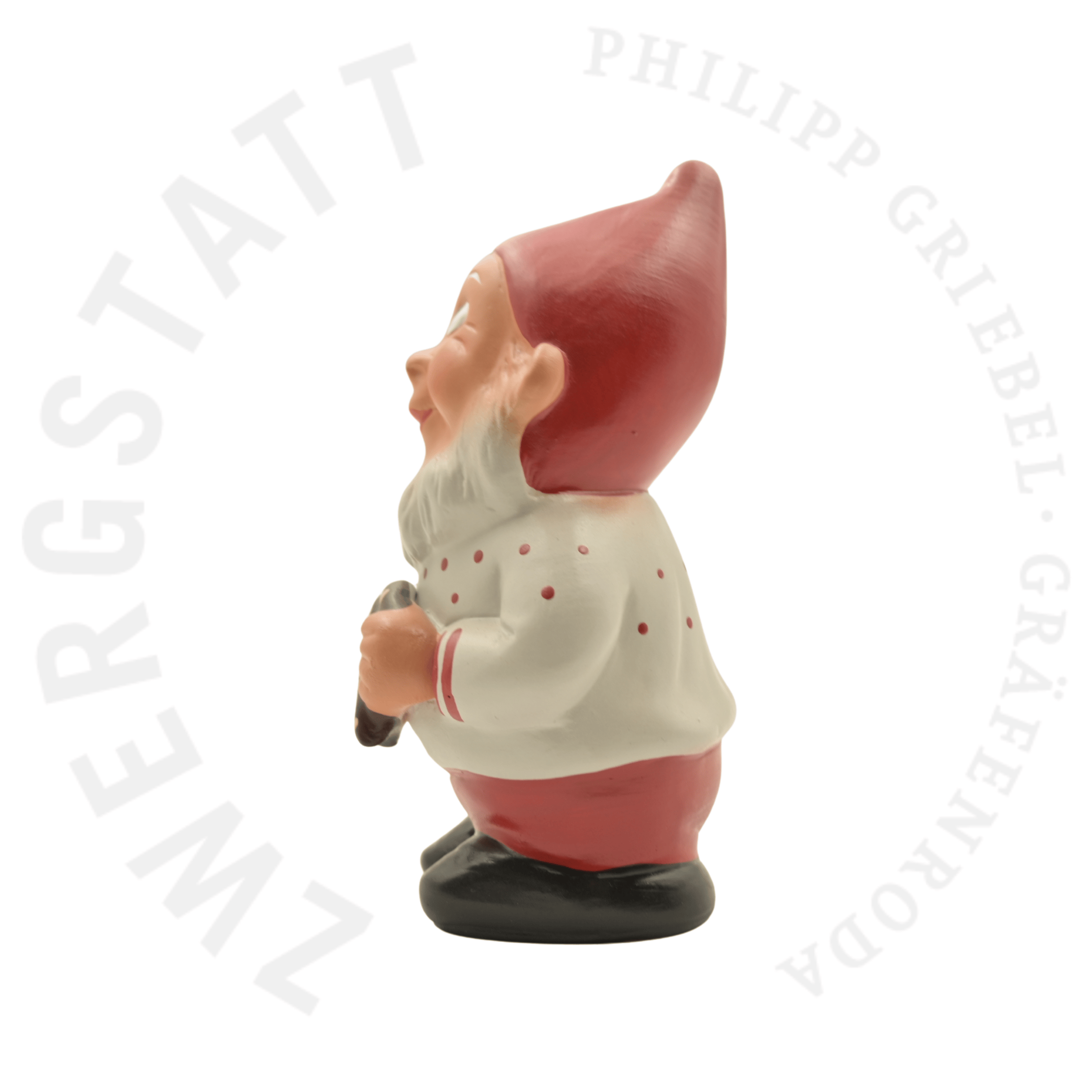 The model is based on classic historical Gräfenroda gnome designs and is reproduced today using the same traditional techniques that have been practiced for over 150 years. Each gnome is individually formed from German clay using plaster molds, carefully dried, fired once, and then entirely hand-painted. This process ensures that every piece is unique, with subtle variations in color and expression that reflect genuine craftsmanship rather than mass production.